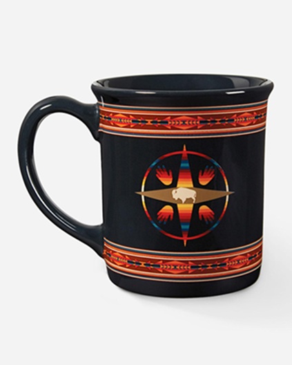 Generously sized ceramic mug is perfect for everything from coffee and cocoa to soup and cereal. Sturdy, durable and sure to be a favorite for years. Based on our Big Medicine blanket pattern honoring the sacred power of the rare white buffalo. Gift boxed.
