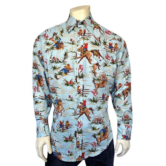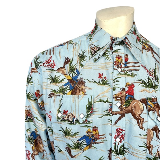 Two classics – Rockmount celebrates the West by combining this fine combed cotton retro print with our signature rodeo design and brand legacy. The combed cotton 100% cotton fabric is soft and comfortable, deeply dyed. Features classic Sawtooth pockets and Diamond snaps. Relaxed fit with rugged double needle construction. Made in USA.