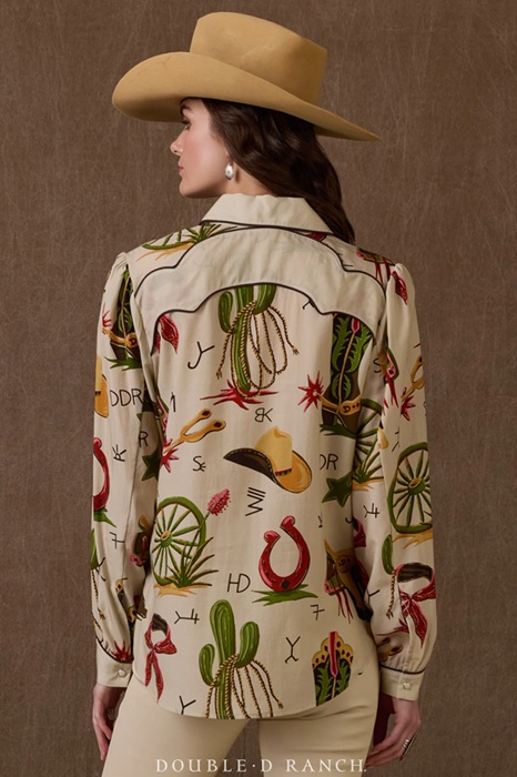 The pearl snap is a quintessential cowgirl classic, and we have reinvented it with next level charm and twang! It’s adorned with this season’s signature print that’s reminiscent of retro Western wallpaper, and the unique yoke and contrasting trim give it a twangy feminine flair. It’s darling with denim and super-chic paired with the bone colored “butter booty” Bandit Pant if you’ve got’em!