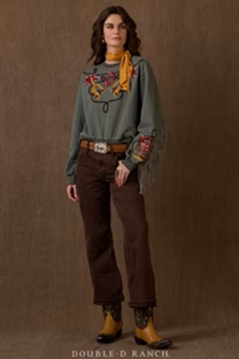 Casual comfort takes a turn toward couture in this extraordinary sweatshirt. The classic cotton top is alluring in an olive green, embellished with bold embroidery of Western icons – a pair of spurs, a horseshoe, and a colorful wagon wheel. It’s finished with tonal fringe that spans from cuff to cuff and across the back. It’s easy to wear and effortlessly awesome.