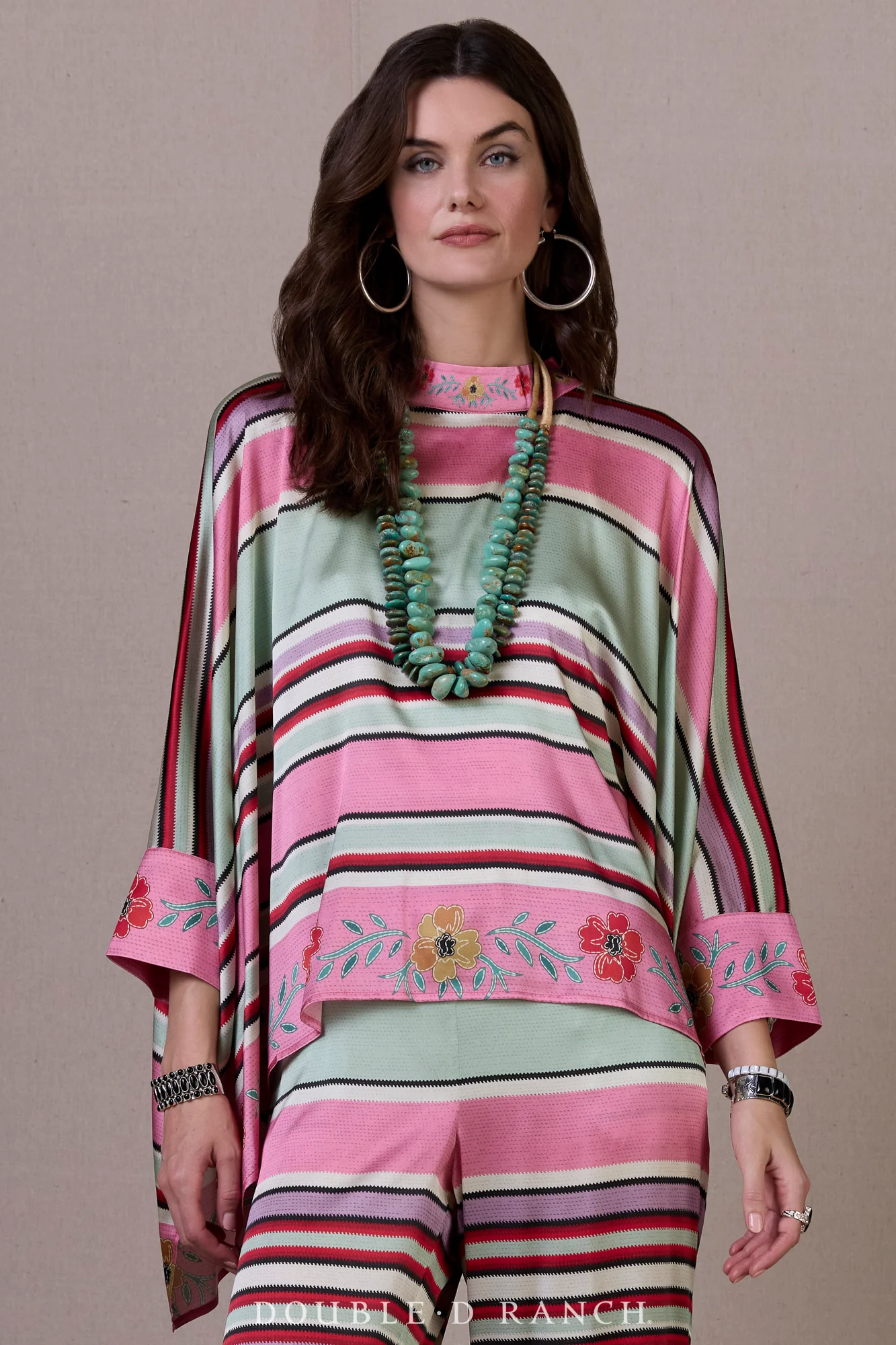 A poncho is arguably the easiest thing to wear – it’s flattering, forgiving, and fabulously chic. We’ve played with a lot of silhouettes over the years, and this one might take the cake. The colorful custom serape (inspired by a table runner we spotted at Round Top market) is ultra-chic in silk and the longer sleeve with cuffs to complement the hem and collar really makes effortless piece look entirely intentional.