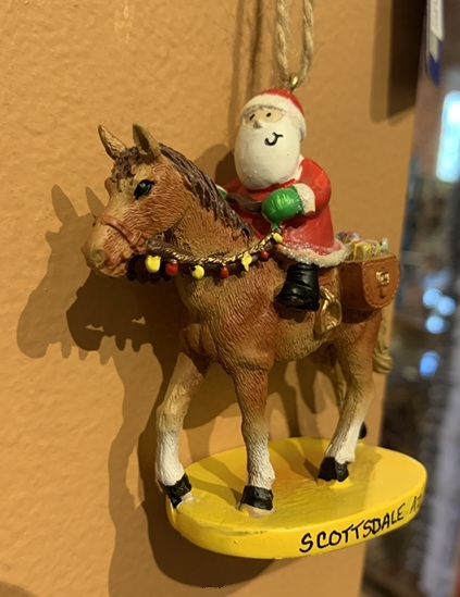Cape Shore ornament of Santa riding a horse with saddle bag full of presents.