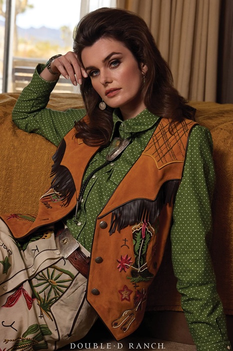 For starters, we simply cannot get over this color. The gorgeous goat suede takes on a whole new level of luxe in this rich amber hue. It’s complemented by colorful embroidery of classic Western icons from a detailed depiction of a saddle to an artistic interpretation of a boot. The yoke is embellished with a mock-plaid beading, trimmed with contrast piping, and finished with some fun fringe!