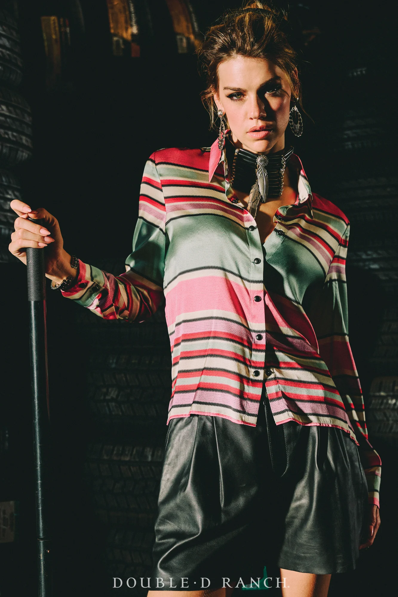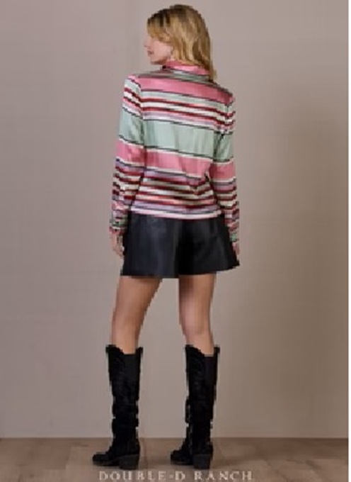 Serape has always been a staple of DDR style, and this colorful custom version was inspired by a piece we spotted at Round Top market that was famously “not for sale”. (Lucky for you, this one is.) It’s slightly scaled up from a traditional serape, and we created it in silk for an elevated spin. This blouse boasts a classic silhouette with a bold black pearl snap placket.