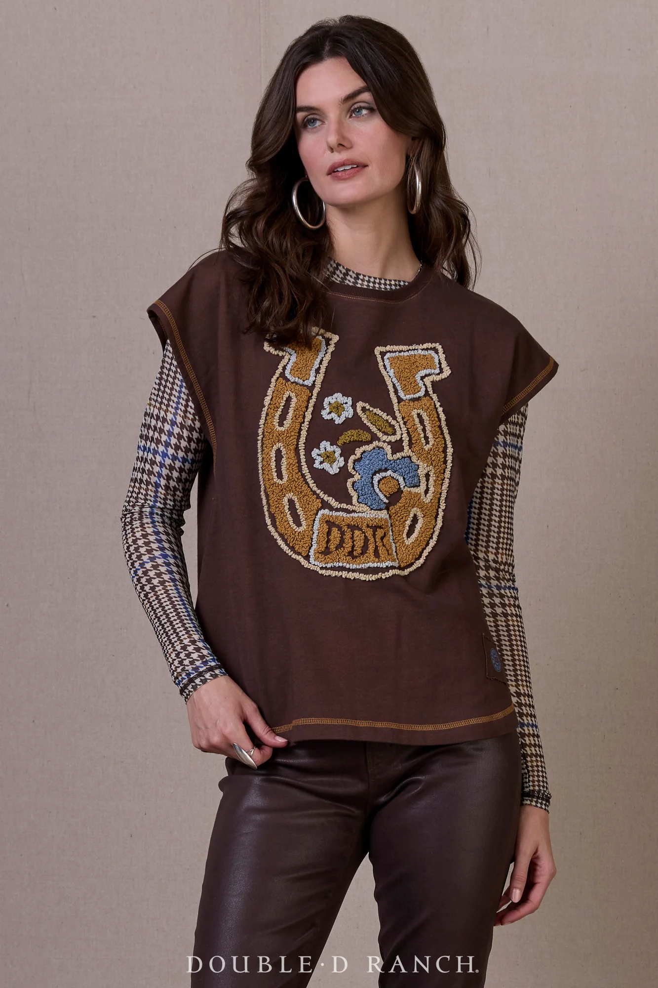 Of course, this cute cotton top is adorable on its own, but we sure are loving it layered, too! (It’s great over the Gamit Tee or pairs perfectly with the McCoy pearl snap.) It’s a lovely ‘chicory’ cotton in a relaxed fit silhouette with a chic dolman sleeve, embellished with contrast stitching and terrycloth embroidery of an oversized horseshoe adorned with flowers and DDR. It’s eye-catching and easy to wear, a win-win for your wardrobe!