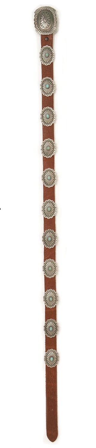 Brown leather with metal silver concho buckle closure buckle dimensions: 2"H x 2 1/2"W small metal silver conchos with faux turquoise stones concho dimensions: 1 1/4"H x 1 5/8"W; 11 conchos total leather. Medium measures 32" along center of belt from fold at buckle...