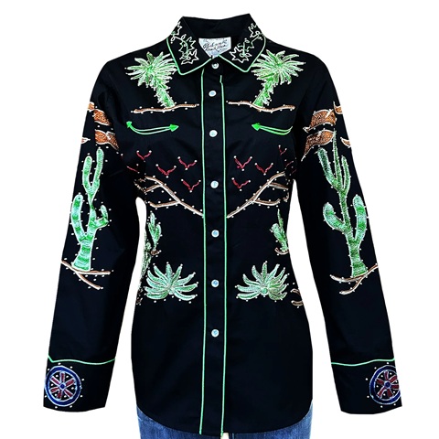 This design represents the art of the master shirt maker like few others. It has it all: palm trees, smile pockets with embroidered arrowhead ends, cacti, covered wagons, wagon wheels, piping, and shotgun cuffs.