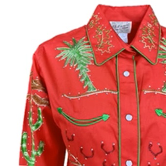 This design represents the art of the master shirt maker like few others. It has it all: palm trees, smile pockets with embroidered arrowhead ends, cacti, covered wagons, wagon wheels, piping, and shotgun cuffs.